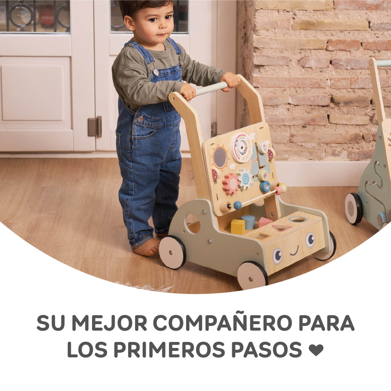 Fabricado con materiales duraderos como madera de pino, MDF y hierro, este correpasillos incluye bordes redondeados y acabados no tóxicos. Su montaje es rápido y sencillo gracias a las instrucciones ilustradas y al mini destornillador incluido.