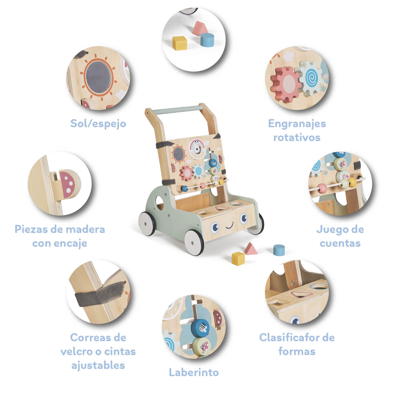 El diseño interactivo de este andador para bebé incluye juguetes sensoriales como puzles de formas, xilófono, espejo giratorio, engranajes, ábaco y bloques de madera. Estos elementos estimulan la coordinación motora, el aprendizaje de colores y formas, y el desarrollo sensorial. ¡Diversión y aprendizaje cada día!